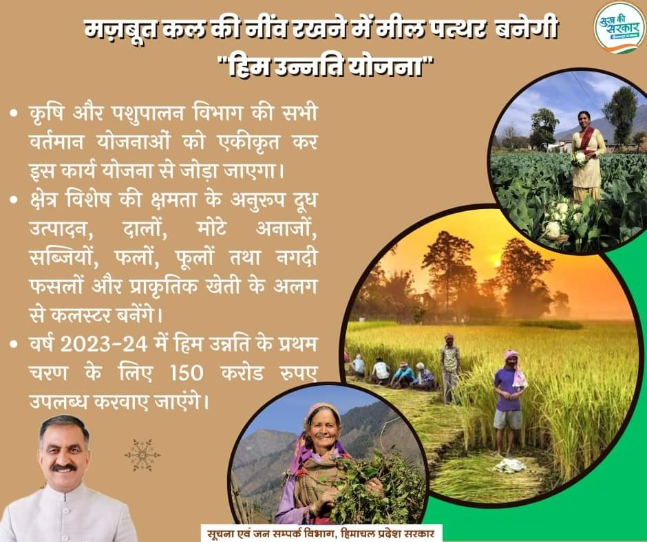 वर्ष 2023–24 में 100 किसान समूहों का गठन किया गया था, जबकि 2024–25 में 10 नए क्लस्टर बनाए गए हैं। किसानों को तकनीकी प्रशिक्षण, विपणन सहयोग और आधुनिक संसाधनों की उपलब्धता सुनिश्चित की जा रही है, ताकि कृषि-आधारित स्टार्टअप्स और स्वरोज़गार के अवसर बढ़ सकें। हिम उन्नति योजना राज्य सरकार की एक महत्त्वाकांक्षी पहल है, जिसके तहत 150 करोड़ रुपये का बजट निर्धारित किया गया है। इस योजना को चरणबद्ध ढंग से लागू किया जा रहा है ताकि इसका लाभ राज्य के प्रत्येक पात्र किसान तक पहुंच सके।योजना उद्देश्य कृषि में समेकित विकास, पर्यावरण संरक्षण, प्राकृतिक खेती को बढ़ावा देना, ग्रामीण अर्थव्यवस्था को सशक्त बनाना तथा युवाओं के लिए कृषि-आधारित स्वरोज़गार के अवसर सृजित करना है। कृषि विभाग के अनुसार, योजना के तहत 40 बीघा या उससे अधिक भूमि वाले 1239 कृषि क्लस्टरों की पहचान की गई है।हिमाचल देश का पहला राज्य है जिसने प्राकृतिक अनाजों के लिए न्यूनतम समर्थन मूल्य तय किया है।