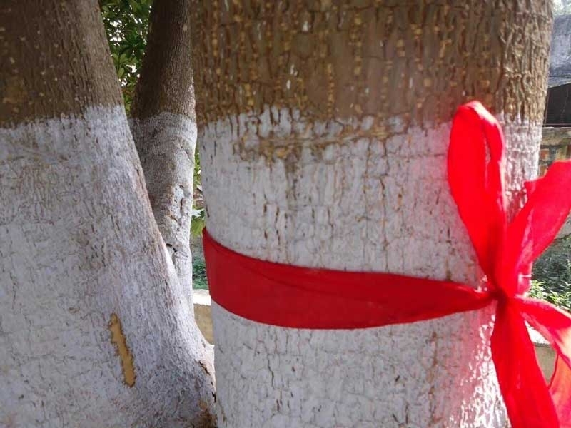 The red ribbons serve as a reminder that cutting down trees is harmful for future generations. Thousands of trees have been marked with red ribbons since 2008 to spread awareness among local people about the importance of conserving natural resources and tackling climate change.